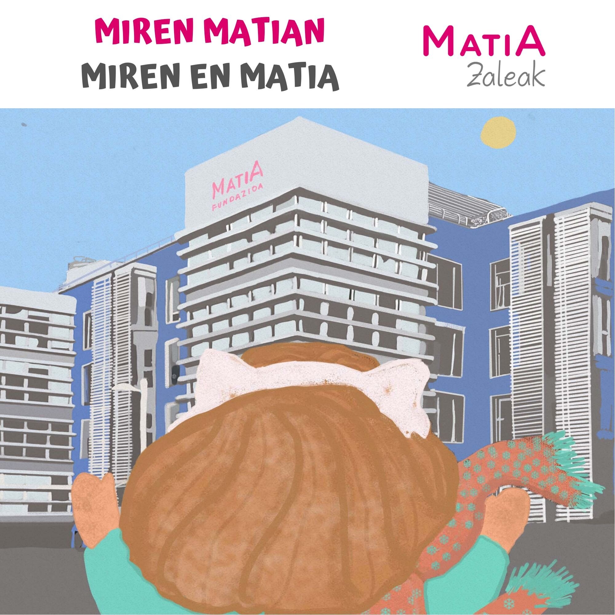 Lo hemos titulado "Miren en Matia": porque en el cuento, Miren, visita junto con sus amigas a su abuela, quien vive en Matia, y van conociendo en la visita lo que es vivir acompañado, amistades de la abuela, sus historias de vida, recorrido y experiencias. De esta forma, Miren y sus amigas van descubriendo la infancia de su abuela, los juegos, la guerra, los derechos que hoy en día gozamos, la importancia de una vida activa, la profesión de modisto de Cristobal Balenciaga...