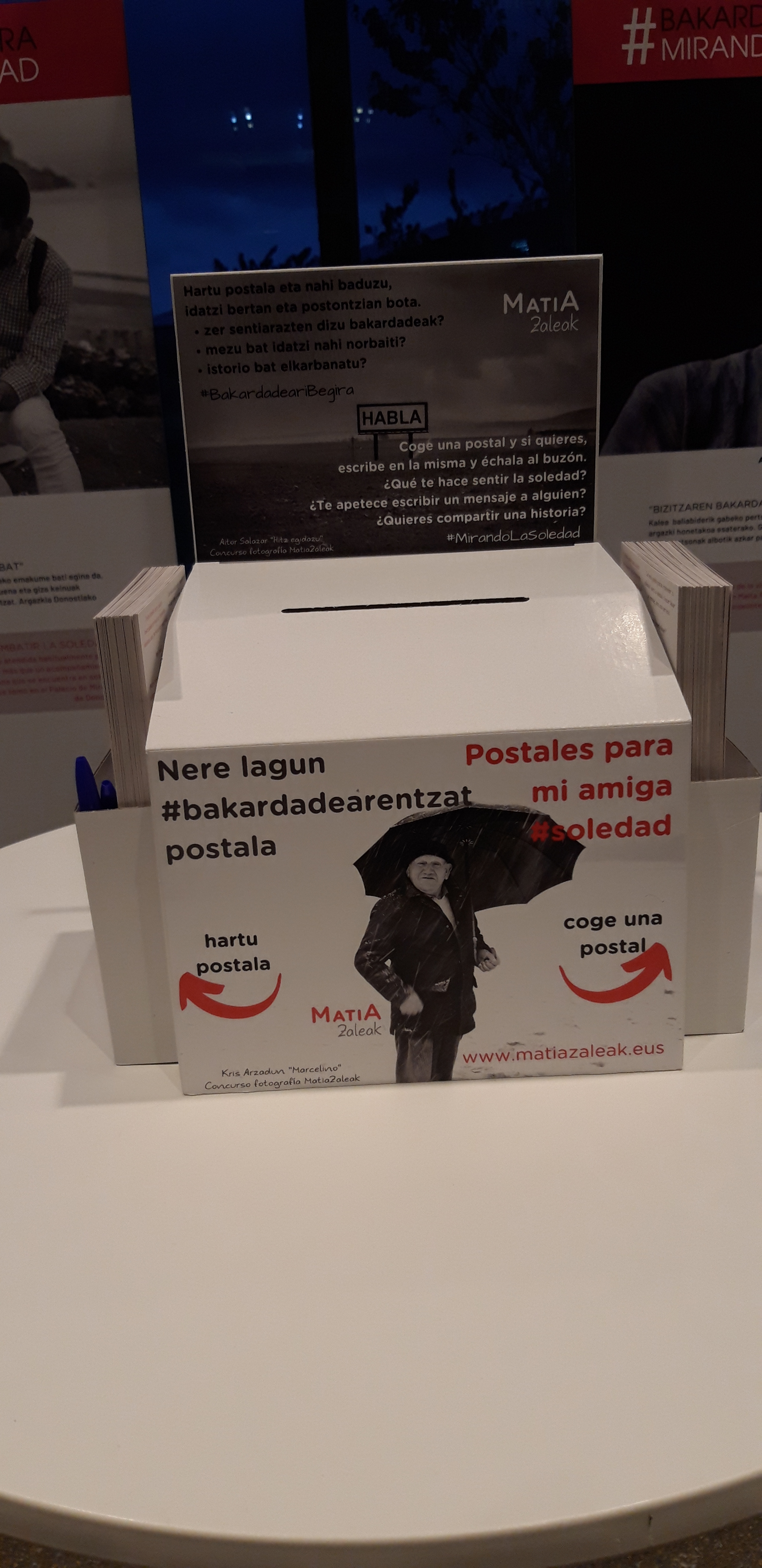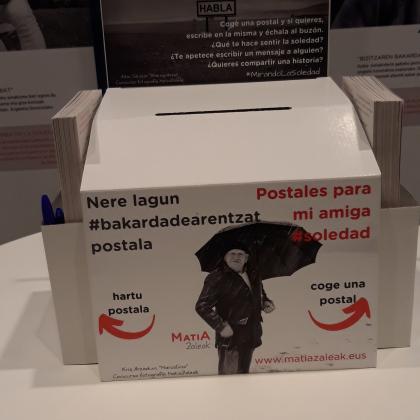 Elkarte kolaboratzaileei esker, Gipuzkoa guztitik postalen banaketa doainekoa egiten ari gara. Postal hauek bi zatitan banaturik daude: goiko aldean argakiza eta ez deseatutako bakardeari aurre egiten dioten kolaboratzaileen logoak azaltzen dira. Eta behekaldean mezu bat idazteko tokia dute. Bakardadearen inguruan sentitzen dugunaren hausnarketa bat izan daiteke, bakarrik sentitzen den norbaitentzako mezu bat, elkarbanatu nahiko genukeen mezu bat, bakardadearekin bizitzeko ikaskuntza bat... Argazkian inspiratu gaitezke, edo aurkitzen garen momentuan, edo gai honekiko gizarteari opa dioguna.